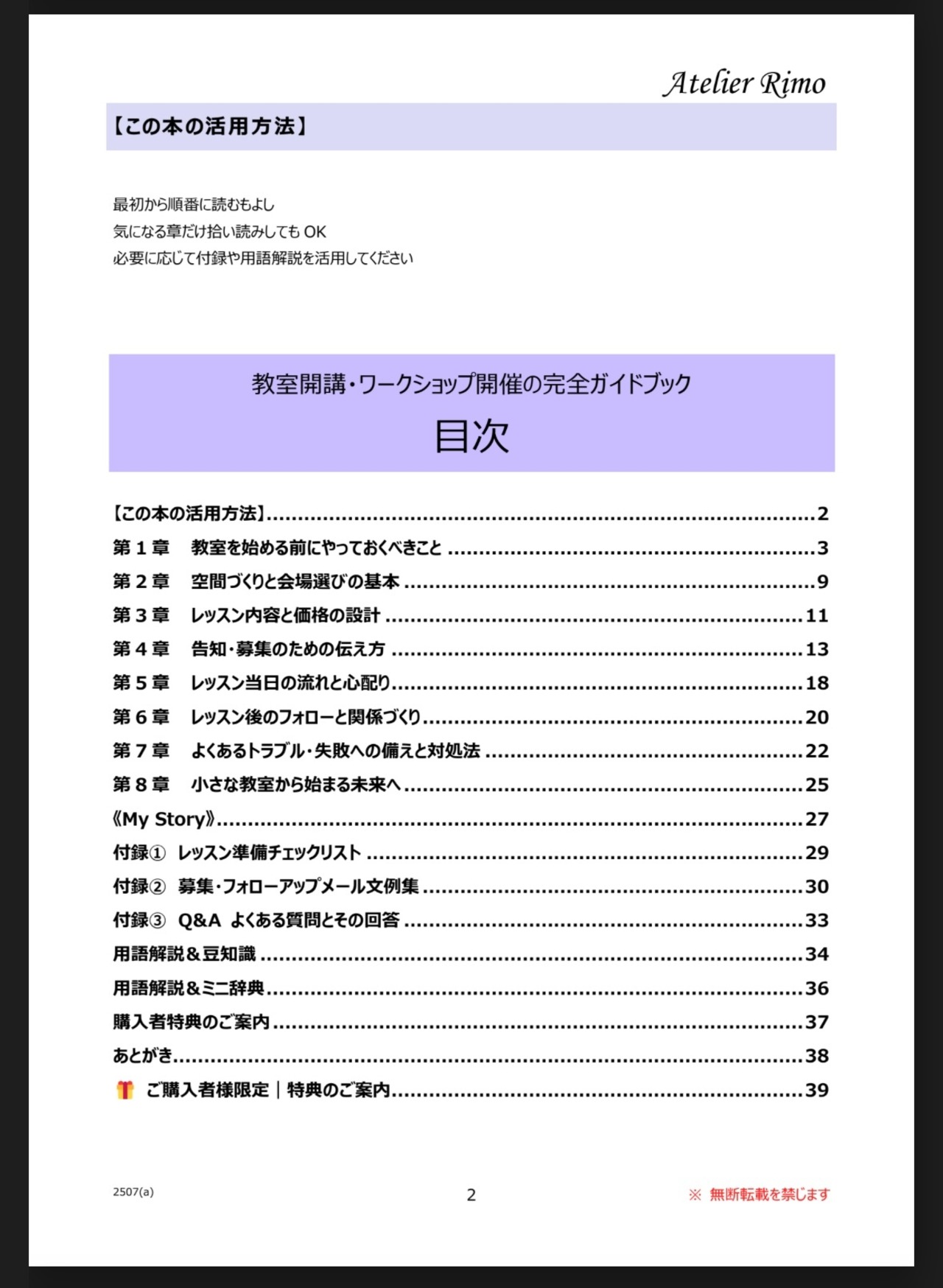 この本は、教室を始めたいあなたのための、全39ページの実践マニュアルです。